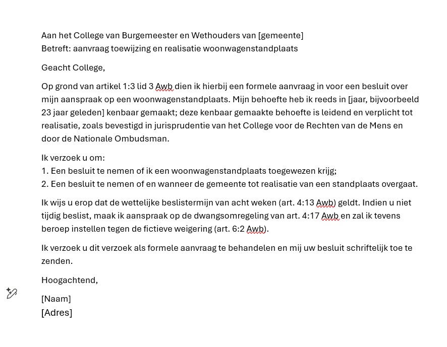 Het niet reageren of afschuiven vormt een schending van de positieve verplichtingen die voortvloeien uit artikel 8 EVRM en de Algemene wet gelijke behandeling. Om dit tegen te gaan, is het van belang dat woonwagenbewoners zelf een formele aanvraag indienen en daarmee een besluit uitlokken. Alleen een formeel besluit kan worden aangevochten bij bezwaar en beroep. Hieronder volgt een stappenplan en een voorbeeldbrief.